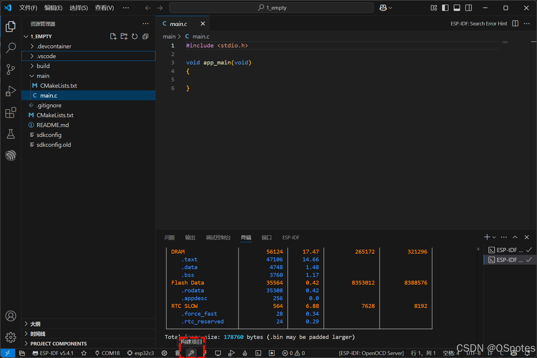 - 单击 VS Code 页面下方工具栏的 "打开 ESP-IDF" 终端 -> 输入