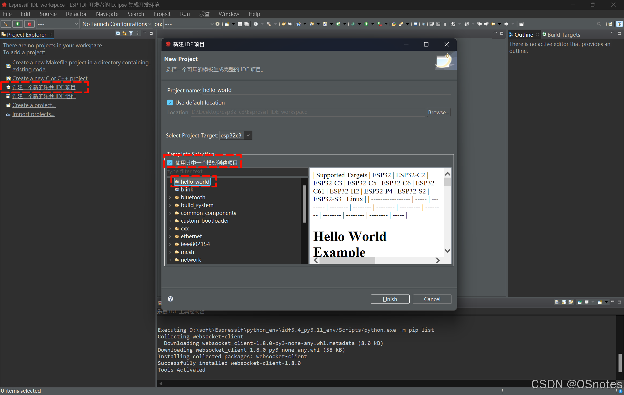 关闭欢迎页面 -> 创建一个新的乐鑫 IDF 项目 -> 使用其中一个模板创建项目 -> 选择 "hello_world" 项目 -> Finish