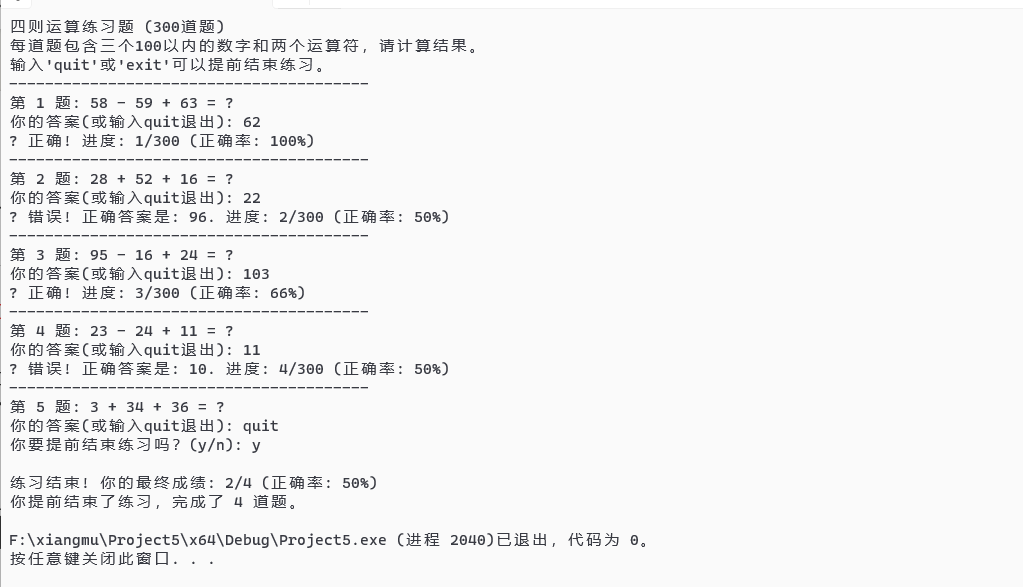 最后是退出命令检查isExitCommand() 函数:该函数用于检查用户输入是否为退出命令(quit、exit 或 q)。它会将用户输入的字符串转换为小写,然后进行比较。以及主程序逻辑初始化:在 main() 函数中,首先使用 srand(time(0)) 初始化随机数种子,确保每次运行程序时生成的随机数不同。定义总题数 totalQuestions 为 300,并初始化已答题数 answered 和答对题数 correct 为 0。循环答题:使用 while 循环,只要已答题数小于总题数,就继续生成新的表达式。调用 generateValidExpression() 函数生成合法的表达式,并输出给用户。获取用户输入,检查是否为退出命令。如果是,询问用户是否确认退出;如果不是,尝试将用户输入转换为整数。调用 calculateExpression() 函数计算表达式的正确答案,并与用户答案进行比较,给出相应的提示信息。更新已答题数和答对题数,并输出答题进度和正确率。结束练习:当已答题数达到总题数或用户确认退出时,输出最终成绩和完成情况。