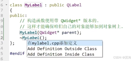- QLabel的构造函数初始化(如下图),这里麻烦的就是需要调用父类的构造函数,才能让自己类的对象加入到Qt对象树中