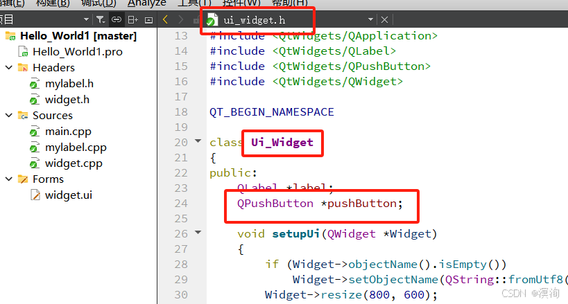 - 细节:Qt就会根据xml代码生成新的widget.h代码(就和label有关,具体如下图)