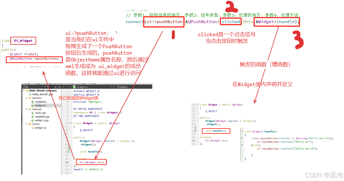 - 创建QPushButton类成员变量 myButton(设置为Widget的成员变量这样就能跨函数(构造函数和触发函数)使用)