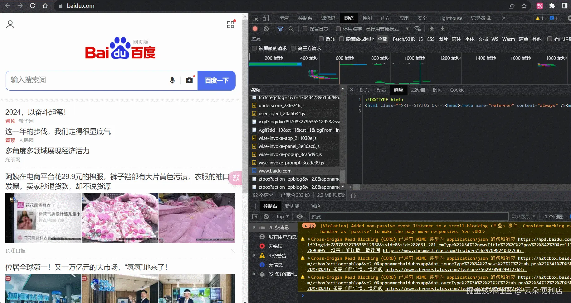 这个就是百度后端提供出来的接口,我们请求的数据就是这个样子,肯定有小伙伴就要疑惑了,数据不是一般都是json对象啥的吗,怎么是html结构。没有人规定数据只能是对象数组,百度的本地就是后端写的,这是个手段,可以解决vue首屏加载过慢问题