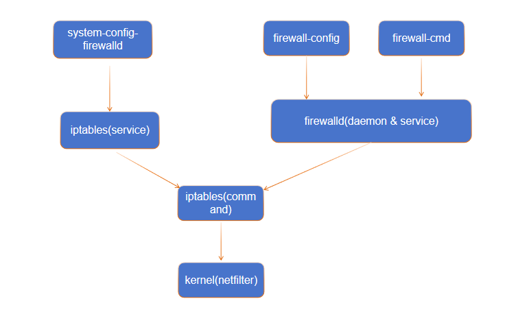 系统提供了图形化的配置工具 firewal1-config、system-config-firewal,提供命令行客户端firewall-cmd,用于配置firewalld 永久性或非永久性运行世界的改变;它以此用iptables工具于执行数据包筛选的内核中的Netfilter通信。