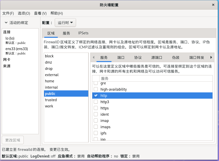 将网络接口 ens33 对应的区域更改为 internal 区域