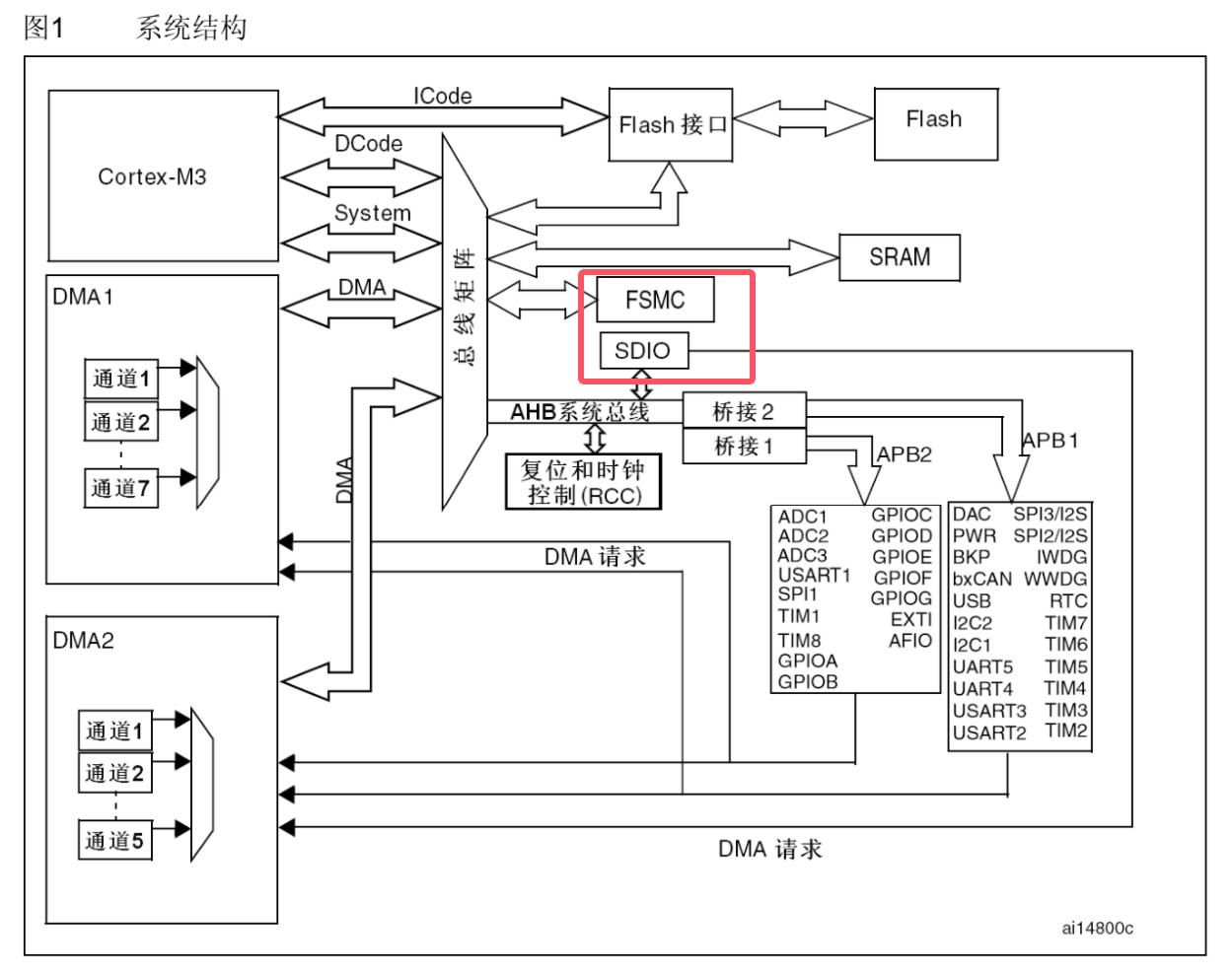 在图中可以看到FSMC是直接连接到总线矩阵的,而SDIO是先经过AHB系统总线的,这种布局能让内存条的读写效率进一步提高。