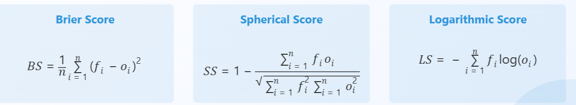 - Proper Scoring Rule:鼓励预测者诚实报告真实概率分布。