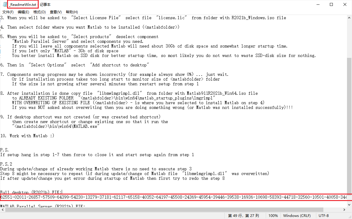 以下步骤都是根据R2021b_Windows\Crack_ReadmeWin.txt文件里的内容翻译的。
