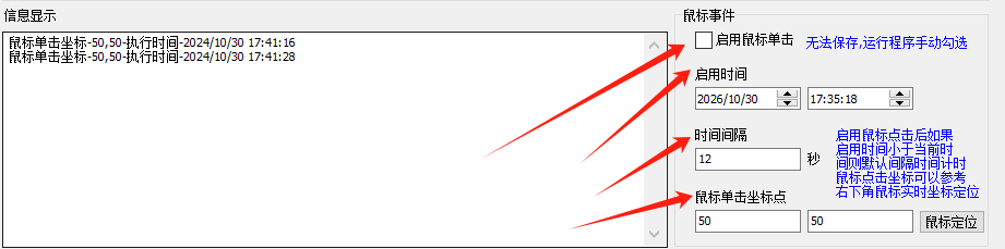 更厉害的是,它还能定时操作鼠标哟!当你设置好启用的时间,再确定间隔多少秒后,它就能在那指定的坐标位置精准点击鼠标啦。这个功能简直就是人工重复点击的"替代神器"。