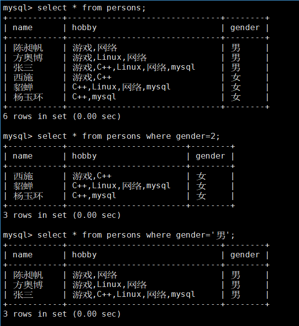由于enum是单选,所以enum查询数据跟一般形式一样。set是集合形式,它的查询方式需要使用 find_ in_ set函数。