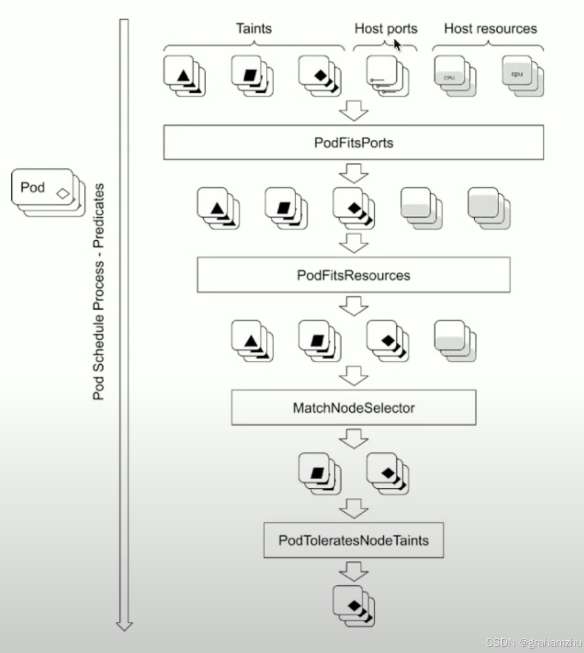 - 在 Kubernetes v1.15 及更早版本中,Predicates 阶段的规则是顺序执行的。每个 Predicate 规则依次对候选节点进行过滤,只有通过所有规则的节点才能进入下一阶段。例如: