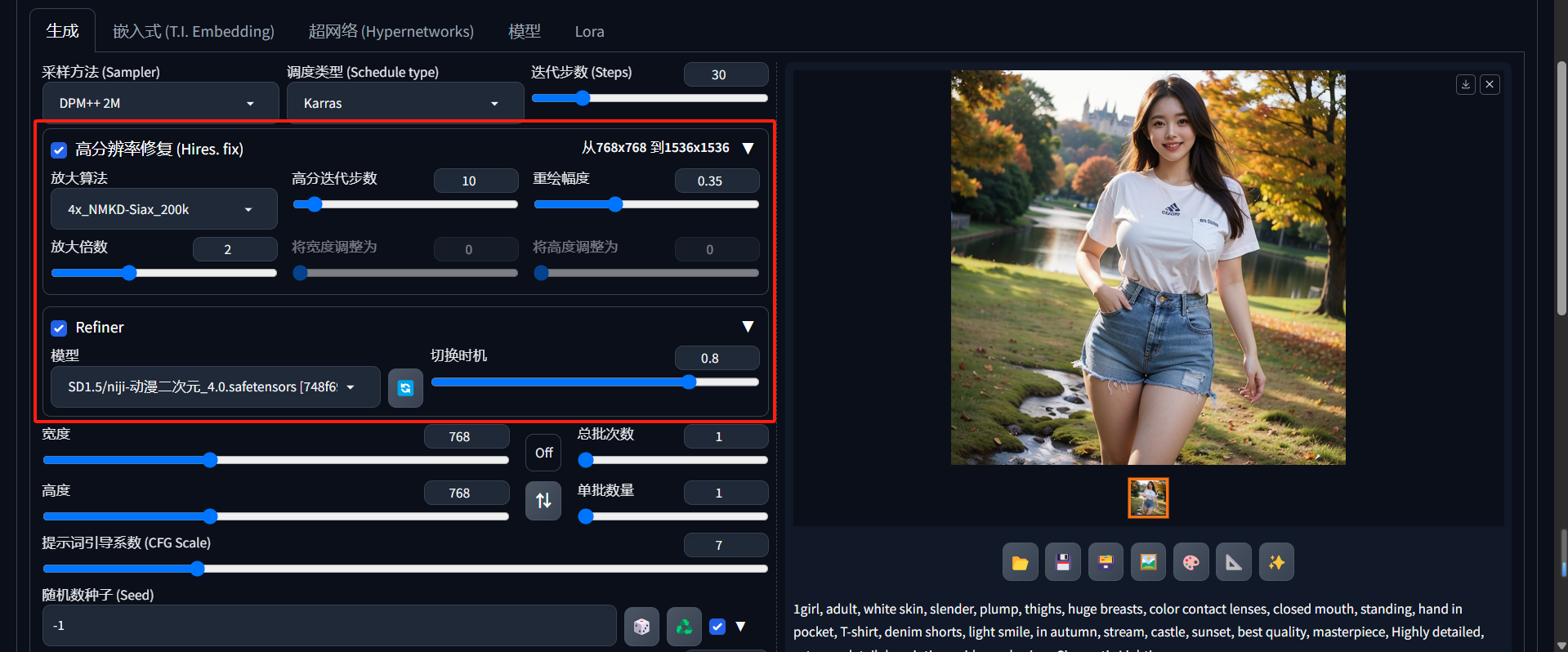高清修复:画完放大(单纯提高分辨率,比如把 512x512 拉到 4K)。 👉 两者可以叠加使用,效果更佳!