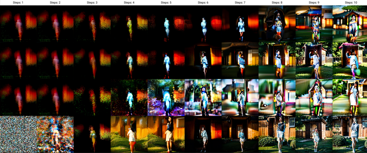 SD在生成图片的时候,就是上述过程的一个逆向过程(也就是逆向扩散),即从一个模糊不清的图片中,逐步去除掉噪点,最终得到一张清晰的图片。