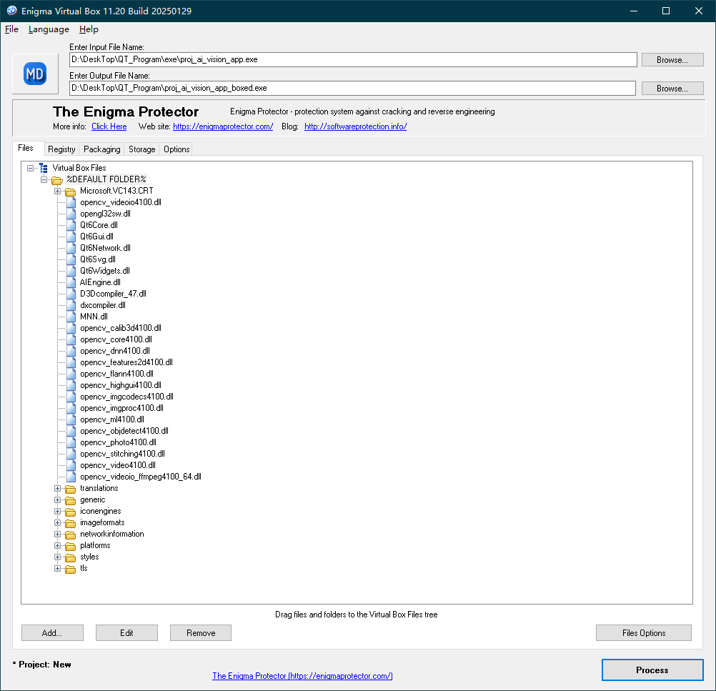 确认 Enigma Virtual Box 的文件列表结构正确后,点击界面右下角的 "Process" 按钮。等待打包完成。然后,将生成的 proj_ai_vision_app_boxed.exe 文件复制到一台没有安装 Qt、VS 开发环境和相关库的干净 Windows 电脑上,双击运行。