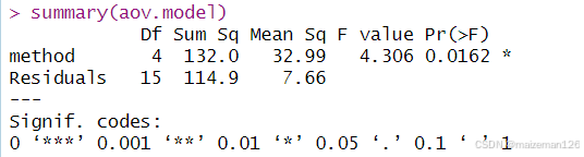 formula是方差分析的公式,在单因素方差分析中,可表示为x~A;data是数据框。可以用summary函数列出方差分析表的详细信息。
