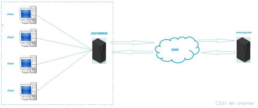 服务器之间,代表客户端向目标服务器发送请求。正向代理服务器接收客户端的请