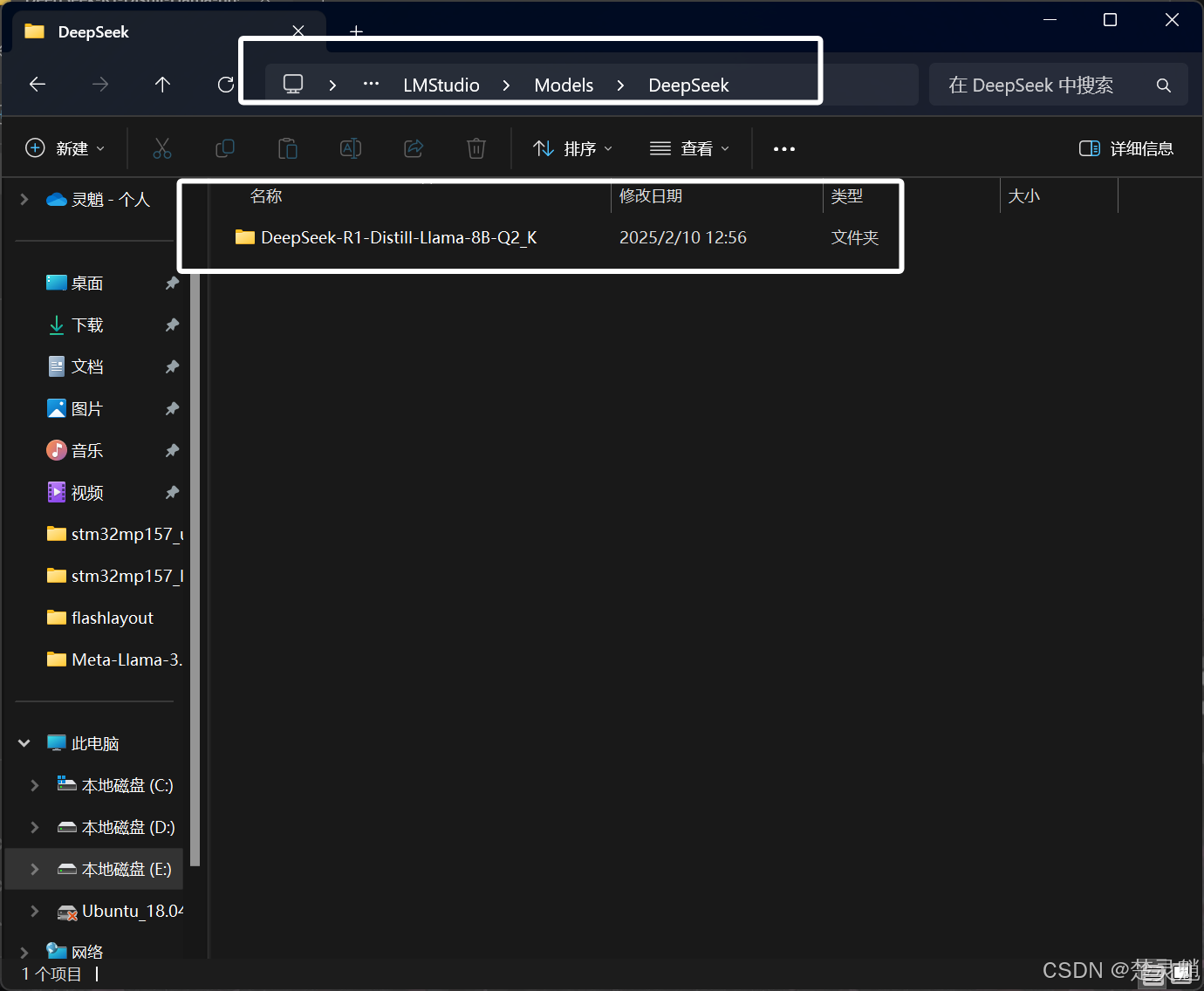 然后我们在这个DeepSeek的目录中新建一个我们模型名字的文件夹,假如我的模型叫"DeepSeek-R1-Distill-Llama-8B-Q2_K.gguf"那我新建文件夹的名字为"DeepSeek-R1-Distill-Llama-8B-Q2_K":