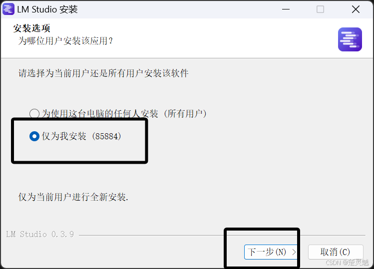 下面的"仅为我安装"和"为所有用户安装"大家自己进行选择,为所有用户安装后,计算机的每一个用户都能看到这个应用,我这里选择的是仅为我安装,如果你是小白,请跟着我操作,选择好以后点击下一步即可: