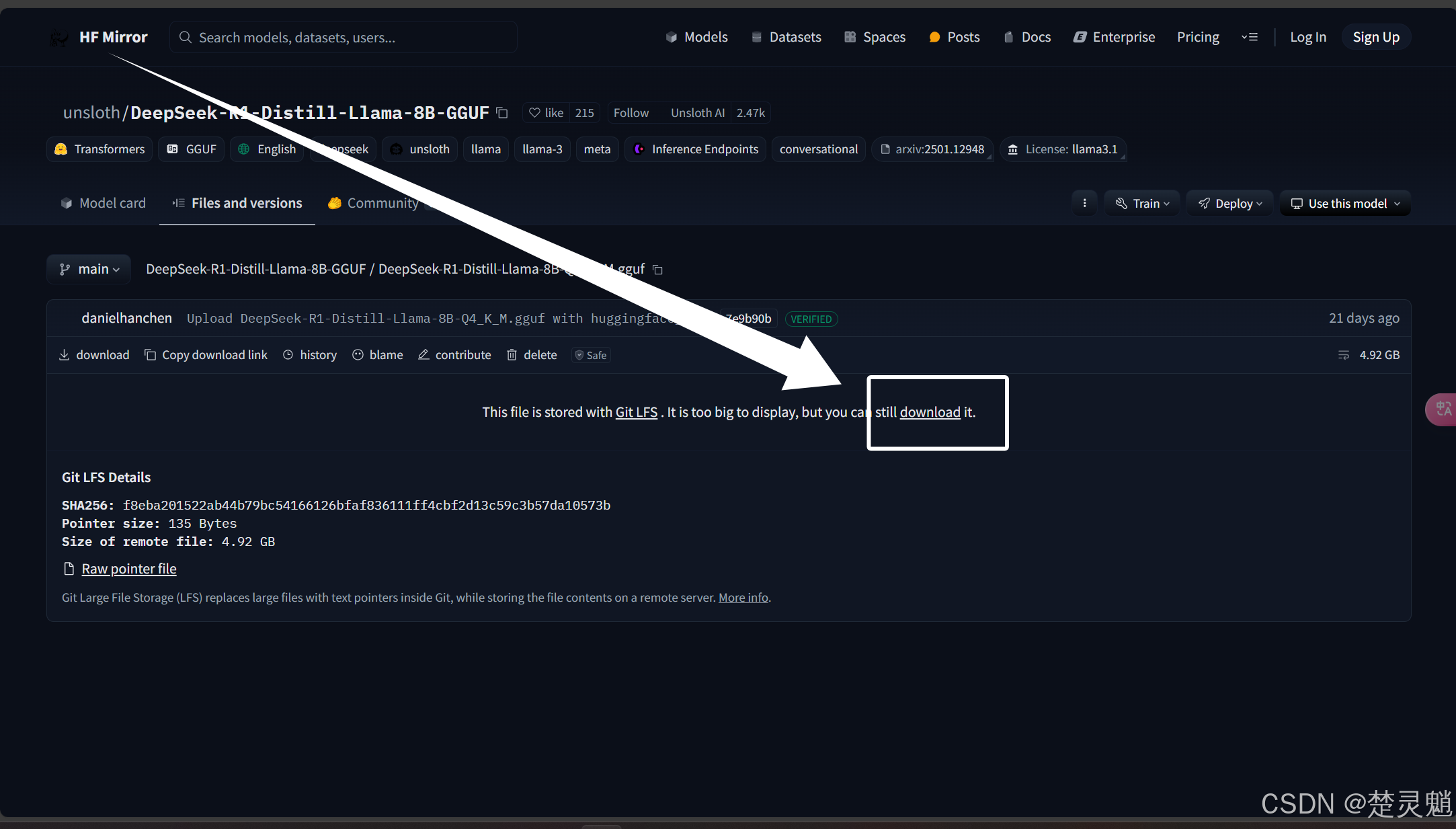现在,就来教大家如何使用我们已经安装好的框架来运行DeepSeek模型。既然这里我们需要运行模型,那么就需要下载一个模型。模型下载的话,推荐大家前往HF Mirror这是一个Hugging Face的模型镜像站,在国内可以直接访问,大家可以直接点击下方的链接前往 :