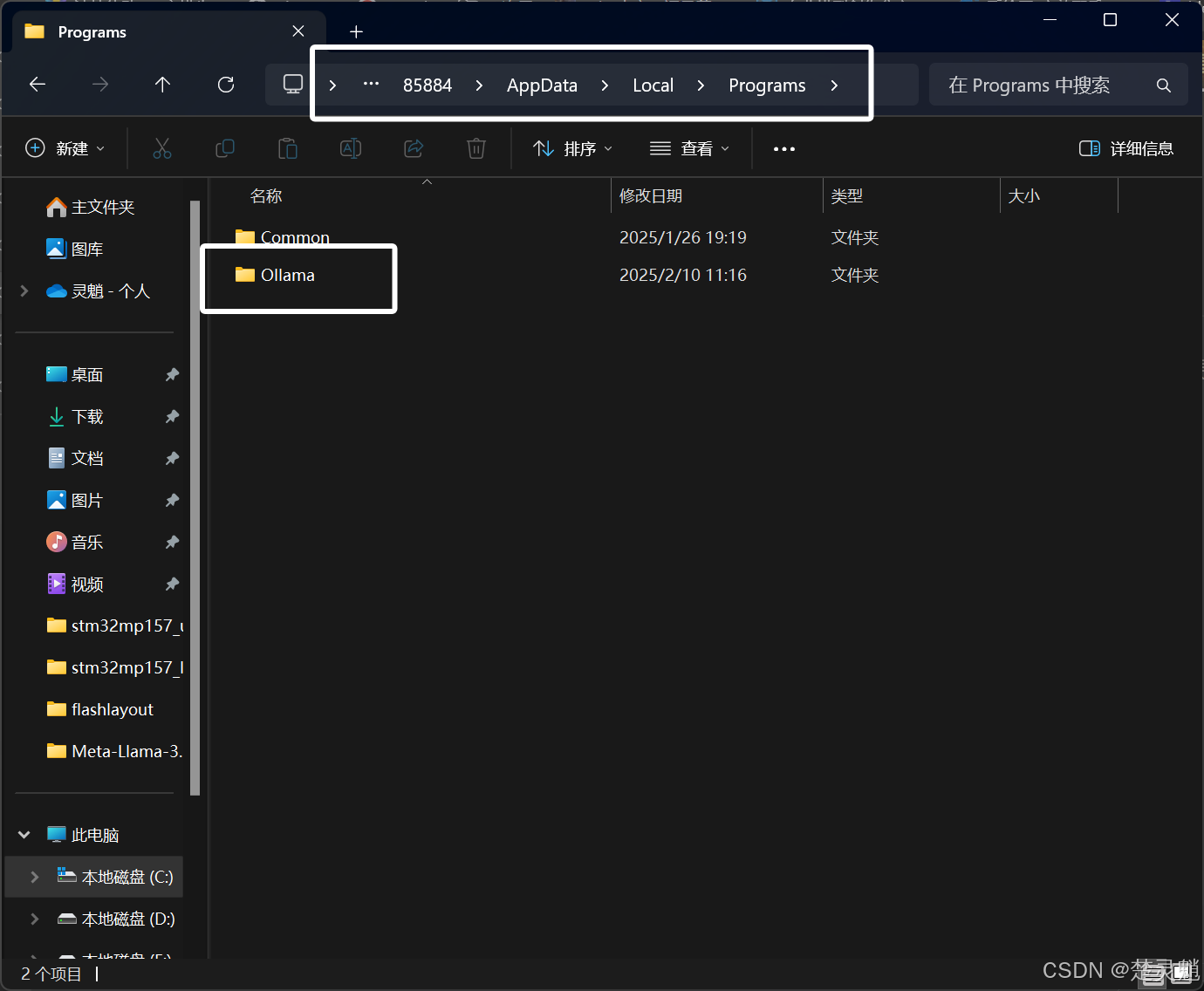 这里,大家需要确定自己的用户文件夹,比如我这里的用户文件夹就是名为"85884"的这个文件夹,进入这个用户文件夹下的"AppData\Local\Programs"文件夹下就可以看到一个名为Ollama的文件夹: