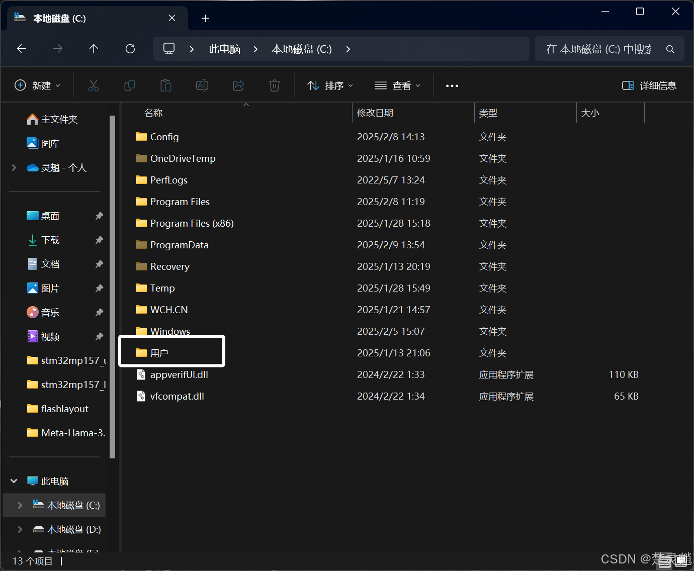 下面来教大家如何修改Ollama的路径,这里我们进入到C盘,有一个名为用户的文件夹,当然你的电脑中这个文件夹可能不叫用户,可能叫Users,这都是同一个文件夹: