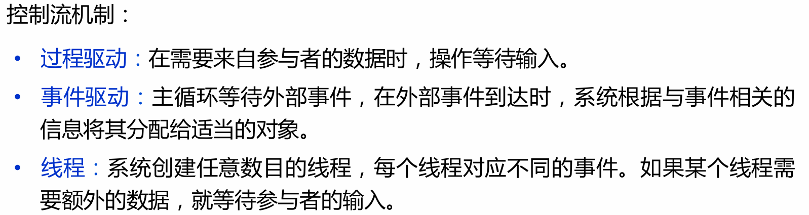 控制流是系统中动作的先后次序。控制流问题需要在设计阶段考虑,其决策取决于操作者或随时间推移所产生的外部事件。