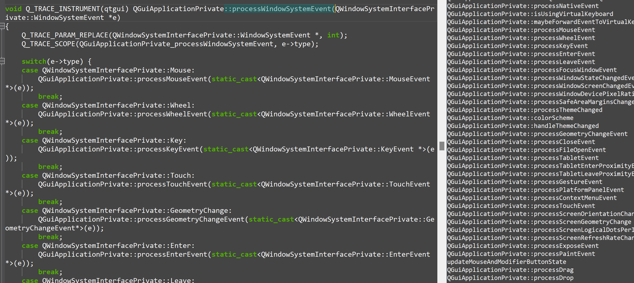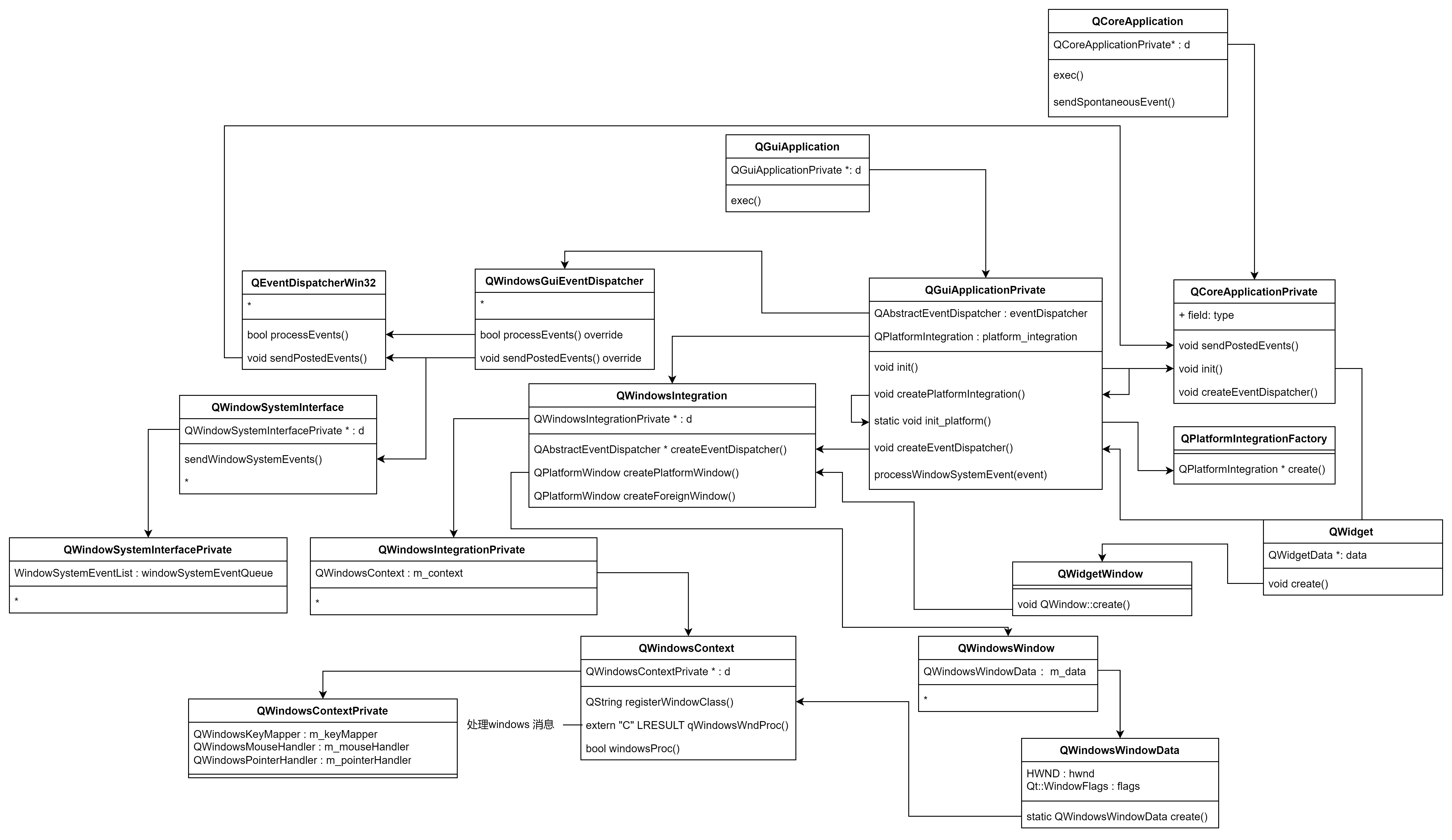 QWindowsIntegration 类是对应 windows 平台的集成类(目录 qtbase\src\plugins\platforms\windows 存放 windows 平台相关类)。再看 QCoreApplicationPrivate::init() 方法,它通过 createEventDispatcher() 方法创建了 QAbstractEventDispatcher 对象。QGuiApplicationPrivate 类(继承自 QCoreApplicationPrivate 类)对 createEventDispatcher() 进行了重载。重载后的方法通过QWindowsIntegration::createEventDispatcher() 方法创建 QWindowsGuiEventDispatcher(继承自 QAbstractEventDispatcher 类) 对象。QWindowsGuiEventDispatcher 类对 processEvents()、sendPostedEvents() 方法进行了重载。重载后的代码如下: