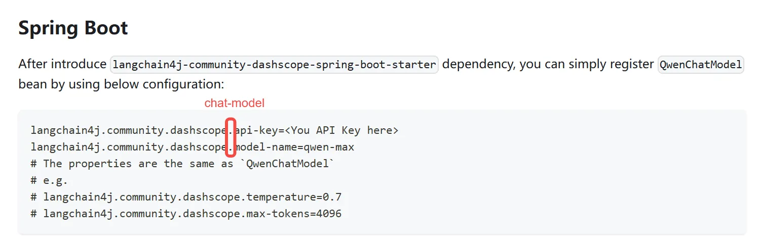 其实官方文档中间是少一个"chat-model",你如果按照他的配置方法,根本没办法完成大模型的自动注入,网上资料千篇一律全是手动创建,但显然不够优雅,无维护性可言。