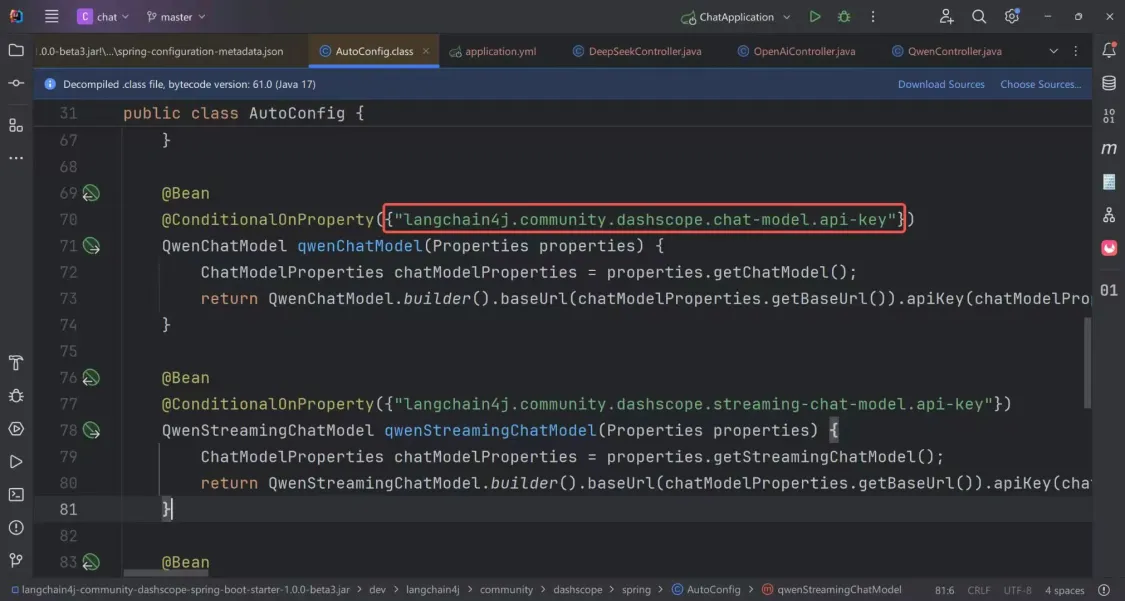 最后看了源码才发现,如果想自动装配,需要配置一个"chat-model",源码如下: