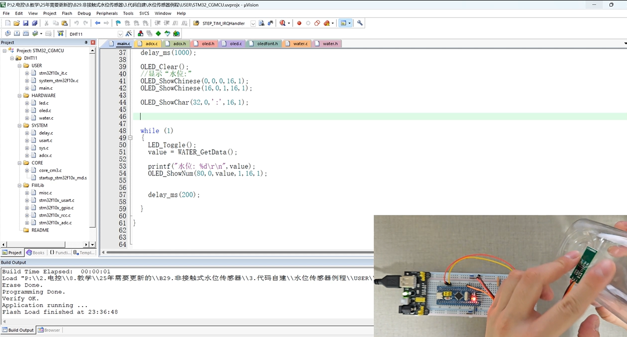 1.使用STM32F103C8T6读取非接触式水位传感器采集的数据,通过OLED上显示
