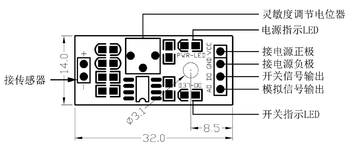 小板的尺寸是3.2cm*1.4cm,电位器可以调节灵敏度。