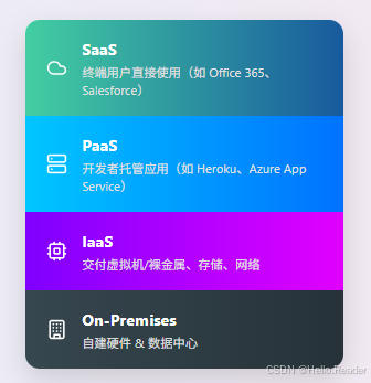 运维责任从低到高:On‑Premises → IaaS → PaaS → SaaS