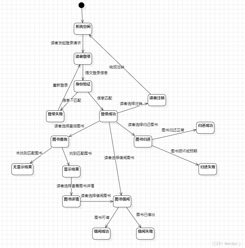 转换是状态之间切换的纽带,由特定触发事件驱动。例如,在 "读者登录" 状态下,读者提交登录信息后,系统触发转换,进入 "身份验证" 状态。如果验证成功,系统进一步切换到 "登录成功" 状态,读者可以进行借阅、归还、查询等操作。