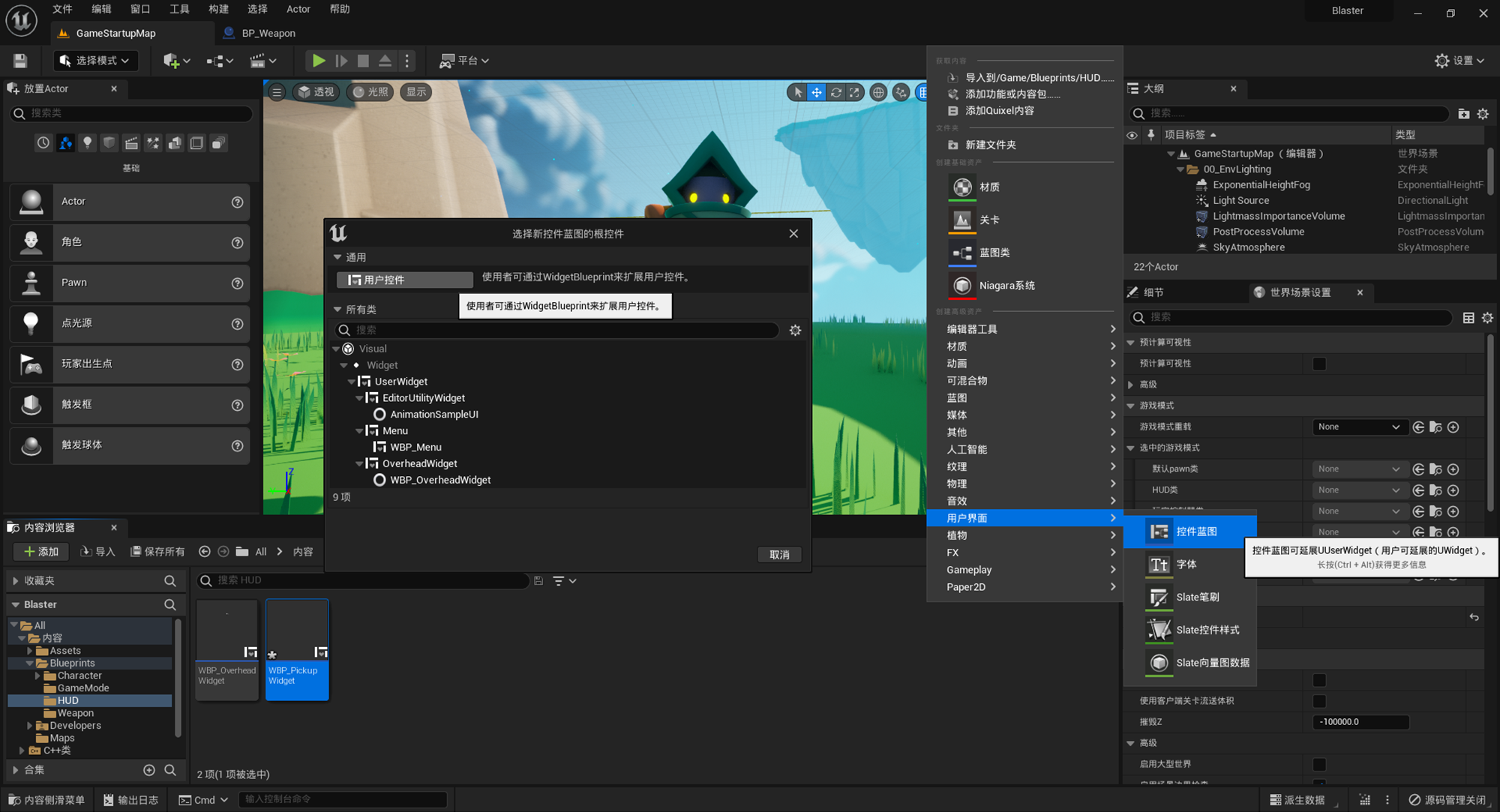 /内容/Blueprints/HUD" 目录下新建一个 "控件蓝图 " 类(Widget Blueprint ) "WBP_PickupWidget"。