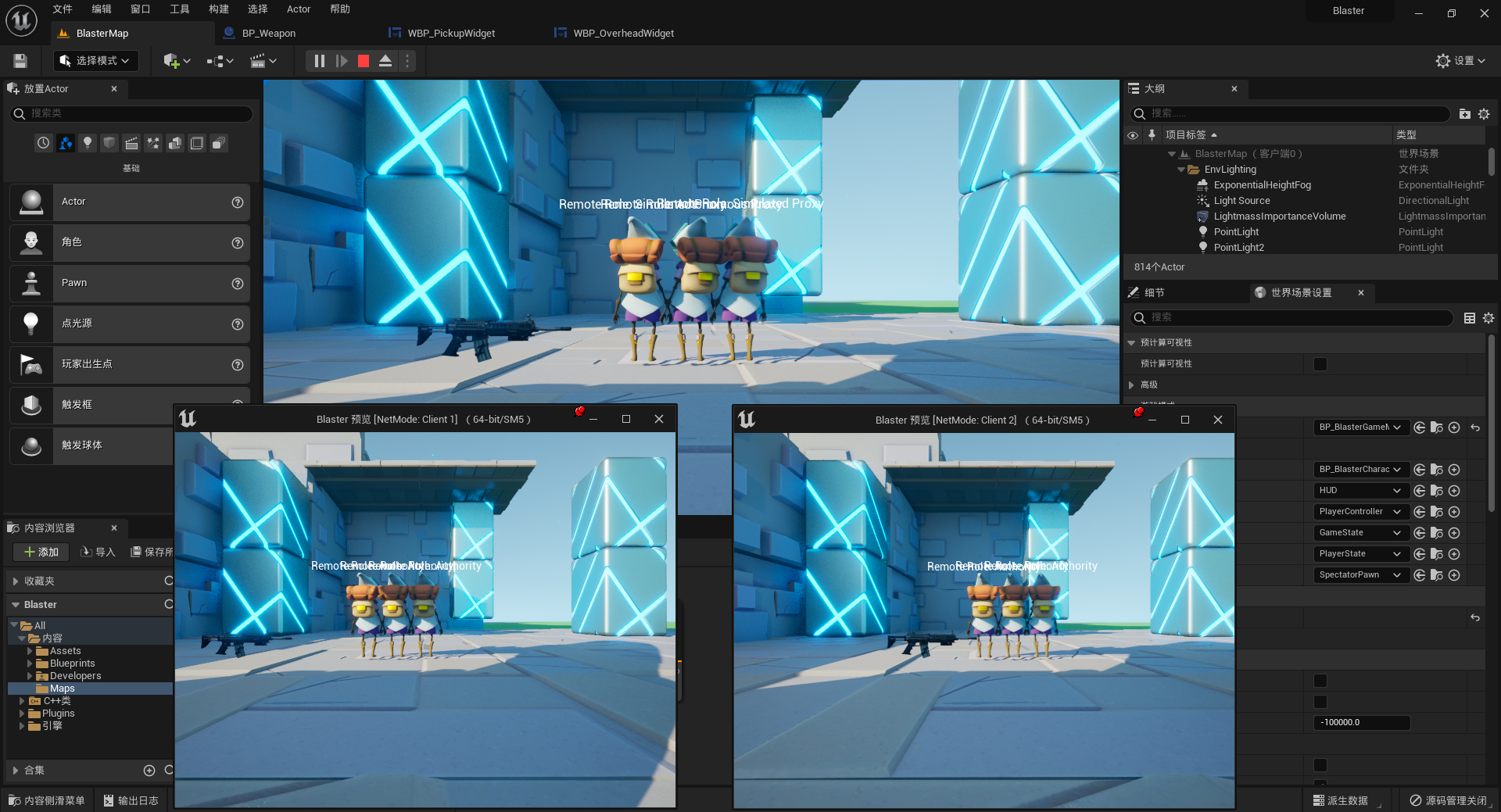 BlasterMap",点击工具栏的 "播放 "(▶ )按钮启动运行,可以看到在监听服务器中和两个客户端中武器上方均出现了文本 "E-Pick Up"。
