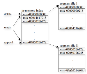 - 简单存储 :Kafka 的存储布局非常简单。每个主题的分区对应一个逻辑日志。在物理上,日志被实现为一组大小大致相同(例如 1GB)的段文件。每次生产者向分区发布消息时,代理只是将消息追加到最后一个段文件中。为了提高性能,我们仅在发布了可配置数量的消息或经过一定时间后,才将段文件刷新到磁盘。消息只有在刷新后才会对消费者可见。