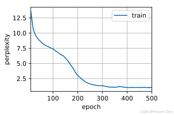 现在,我们训练循环神经网络模型。因为我们在数据集中只使用了10000个词元,所以模型需要更多的迭代周期来更好地收敛。