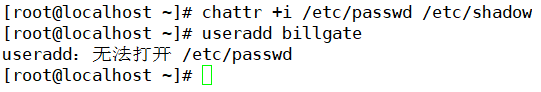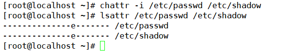 如果服务器中的用户账号已经固定,不再进行更改,还可以采取锁定账号配置文件的方法。使用chattr 命令,分别结合"+i""-i"选项来锁定、解锁文件,使用 1sattr 命令可以査看文件锁定情况。