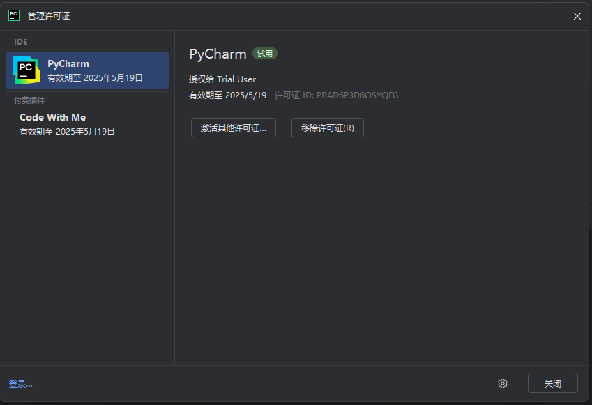 再看看我们PyCharm的许可证,我们目前还是试用期,一个月以后就需要购买正版了。(目前笔者还不知道免费版是否至此此功能,后续通过实践给大家献上答案)