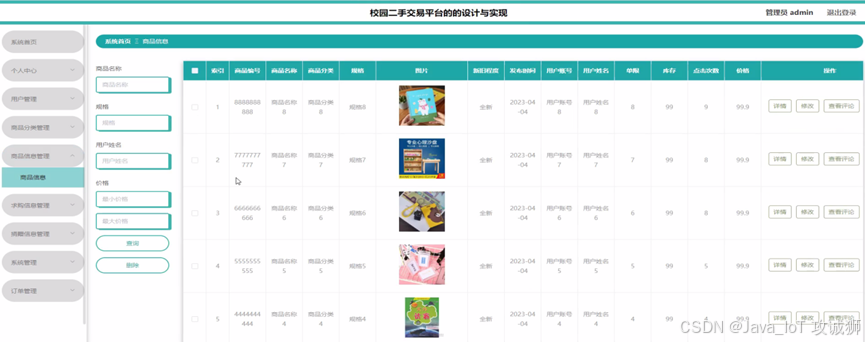 用户在登陆之后,可以查看校园二手物品交易平台上用户发布的二手物品信息以及在平台上发布自己的二手闲置物品,用户可以使用求购功能对平台上自身所需的二手物品进行求购功能,所求购的二手物品拥有者可以查看到用户的求购请求并且通过平台联系到用户进行二手物品的交易,同时用户自身也可以查看自己在平台上发布的二手物品信息和其他用户对自己发布的二手物品的求购意向。用户自身也可以对自己发布的二手物品信息进行下架或者更换。管理员板块包括查看、咨询以及维和用户信息以及平台二手物品信息等功能。管理员可以通过登录特定的平台管理员账号登入到平台后台进行用户信息以及物品信息的管理,管理员可以使用自己的管理员权限对非正常使用以及违规使用平台的用户进行封禁并且对不合规的二手交易物品进行及时的干预下架。进入系统后,管理员可以查看个人中心、用户管理、商品分类管理、商品信息管理、求购信息管理、捐赠信息管理、以及系统管理等内容。