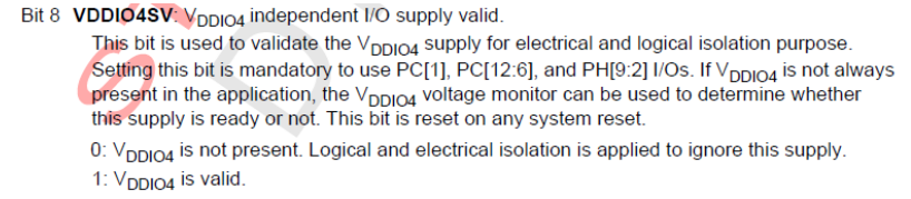 另外,还需要注意寄存器 VDDIO4SV@PWR_SVMCR1, 使用 PC[1]、PC[12:6]和PH[9:2]I/O 时,必须设置此位。