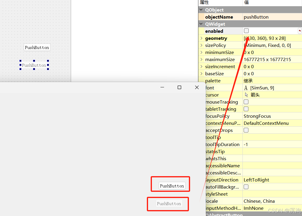 通过拖拽快速生成两个按钮控件,他们都是继承于QWidget的,所以将属性设置为enabled时就会无法使用: