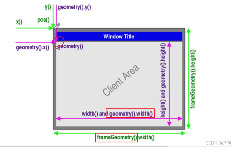 - 可以把它理解成4个属性的统称或者是一个结构体(QRect类)内部是有 x、y、width、height 四个属性,通过这四个属性就能知道或者设置该控件的位置和大小(如下图)
