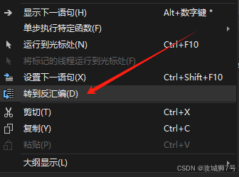 如下代码示例均可在vs软件断点调试时,在代码处右键弹出反汇编选项,点击后即可看到对应的汇编代码。