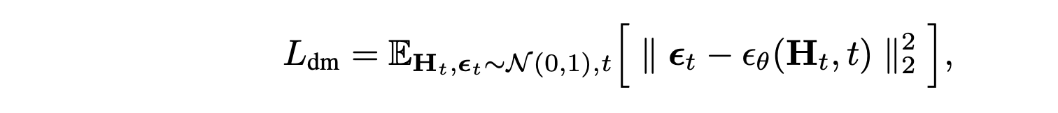 此处,条件分布 p_θ (·|N_o, N_l) 由一个权重为 θ 的扩散模型参数化,该模型对 N_o 个目标潜样本和 N_l 个车道潜样本进行采样。与基于图像的模型不同,p_θ 必须适应可变的潜样本大小,因此设计一个基于 AdaLN-Zero 条件的定制 Transformer 架构 [52]。该架构与自编码器类似,由一系列 NDM 分解式注意模块组成,其中包含连续的目标-到-车道、车道-到-车道、车道-到-目标和目标-到-目标的注意层。这种分解式处理方法允许每一层对特定层的交互进行建模,同时允许目标和车道标记具有不同的隐藏维度。值得注意的是,由于真实车道生成需要高度的空间推理和细节,车道 tokens 需要更大的隐藏维度,而目标 tokens 则能有效地用较小的维度表示,这使得扩散模型整体上更高效。采用标准 DDPM 目标函数来训练 p_θ,其中 p_θ 被参数化为噪声预测网络 ε_θ,该网络学习预测不同噪声水平下带噪声车道和目标潜特征的噪声:
