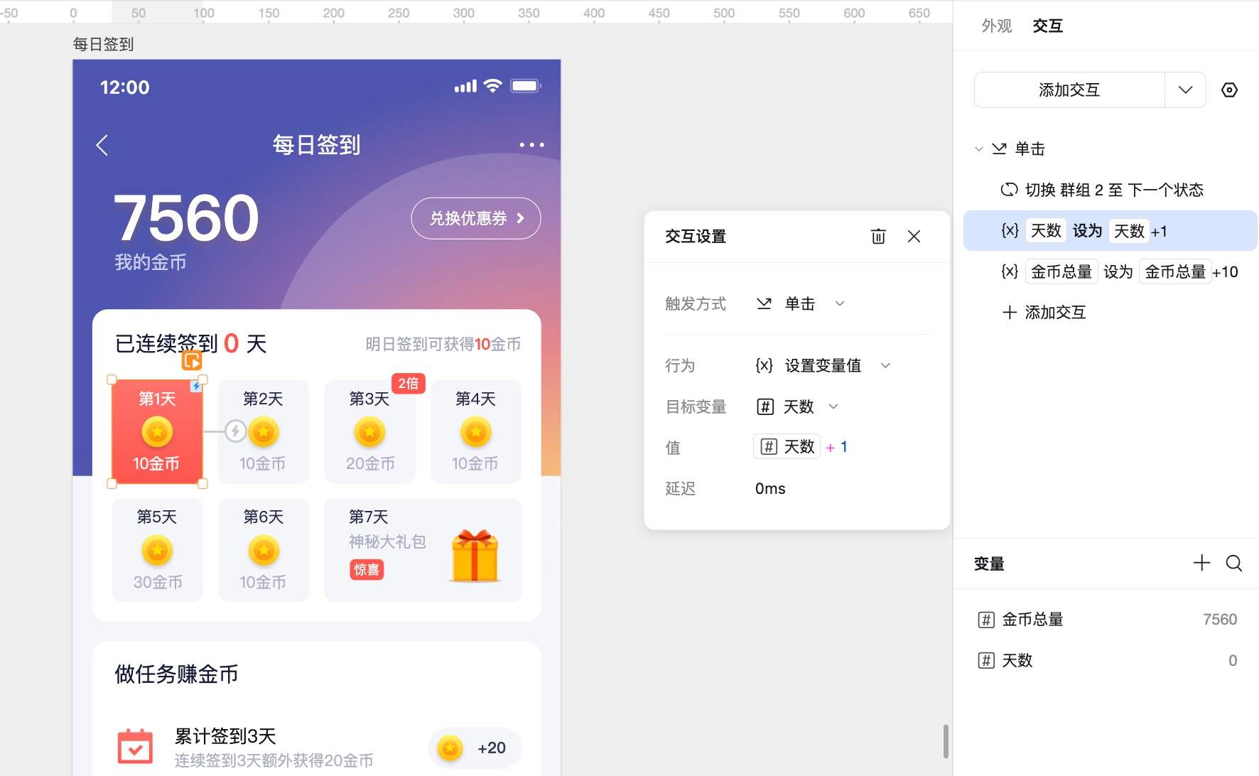 与Axure的繁琐配置相比,墨刀的交互功能操作十分简单。举例一个常见签到金币变量的例子,使用墨刀进行变量设置与交互条件的操作,只需要简单3步 ,即可0代码实现交互效果: