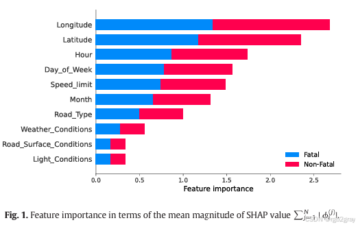 为了更准确地衡量特征的重要性,作者采用了SHAP值的平均绝对值作为指标。SHAP值基于合作博弈论,能够量化每个特征对模型预测的贡献。结果显示,经度、纬度和小时是影响事故严重性的三个最关键特征,其中经度的重要性位居榜首,随后是纬度和小时。