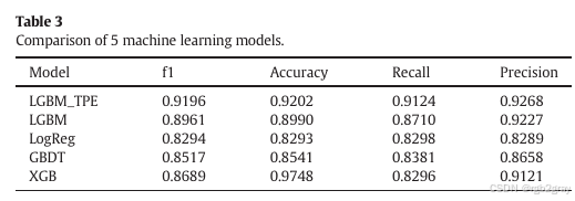 在这一部分,作者对比了LightGBM-TPE与其他四种主流机器学习模型(LightGBM、逻辑回归、GBDT和XGBoost)的预测性能。对比的指标包括f1分数、准确率、召回率和精确率,而模型性能的验证则通过5折交叉验证完成。具体来说,数据集被随机分为5个连续的子集,每次将一个子集作为验证集,其余四个子集作为训练集,最终结果取五次验证的平均值。