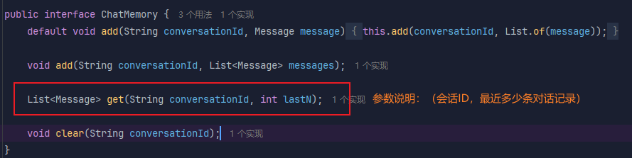 这里使用默认方式,由源码 可知是基于 Map 直接存入内存中的;当然也可以重写 ChatMemory ,比如存入到 Redis 中做缓存之类的(根据业务需求)