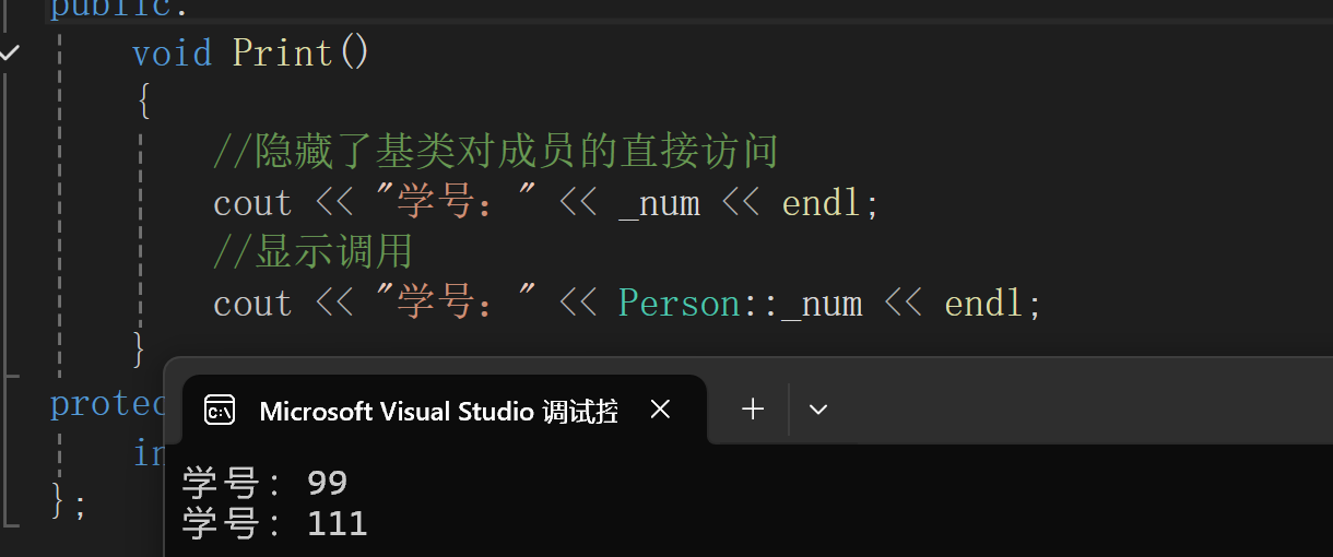 我们可以看到只有使用了 基类::基类成员 的方法显示访问了以后才能输出我们想要的数据。明明继承了基类,但因为成员重名,所以隐藏了对基类成员的直接访问。